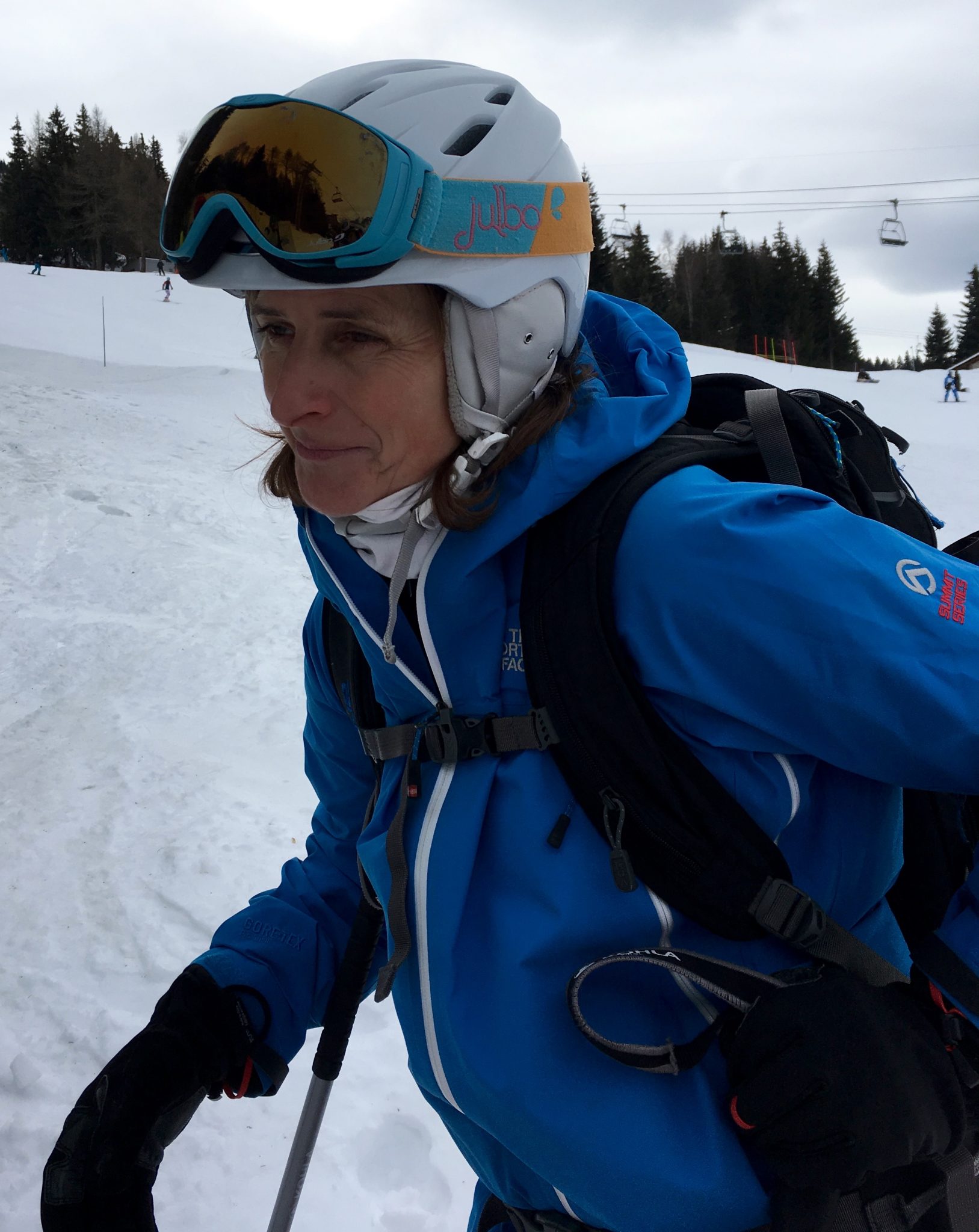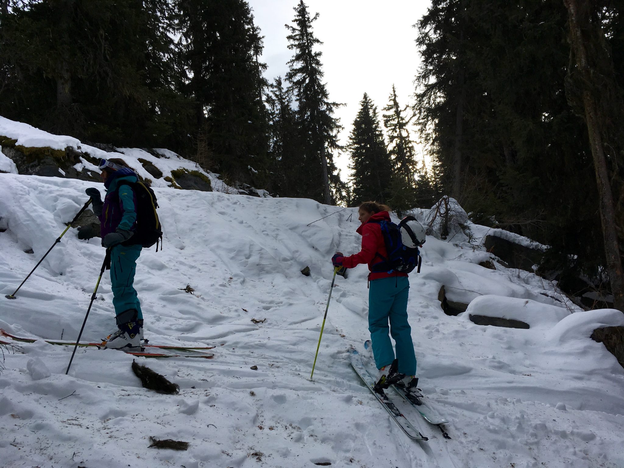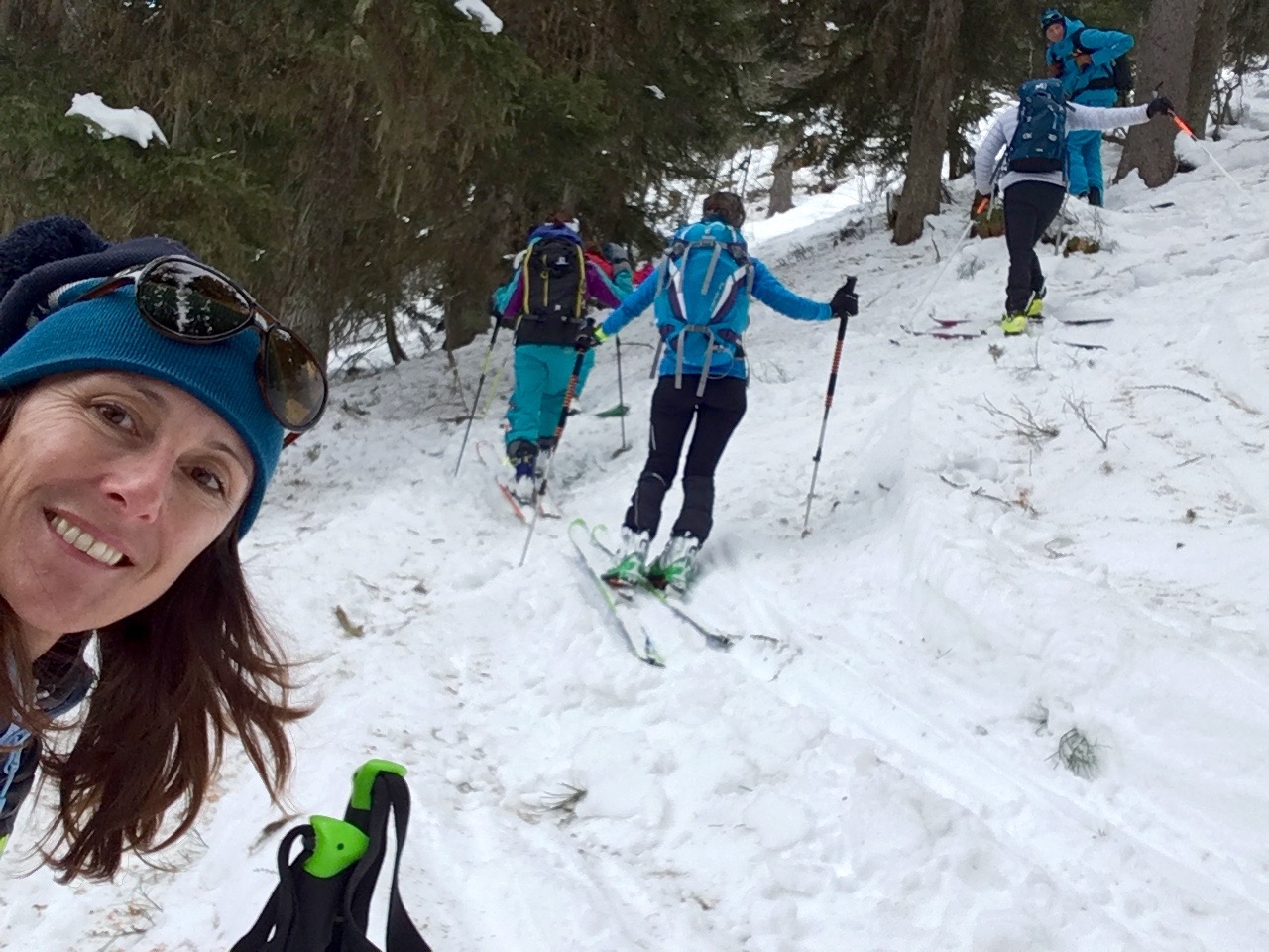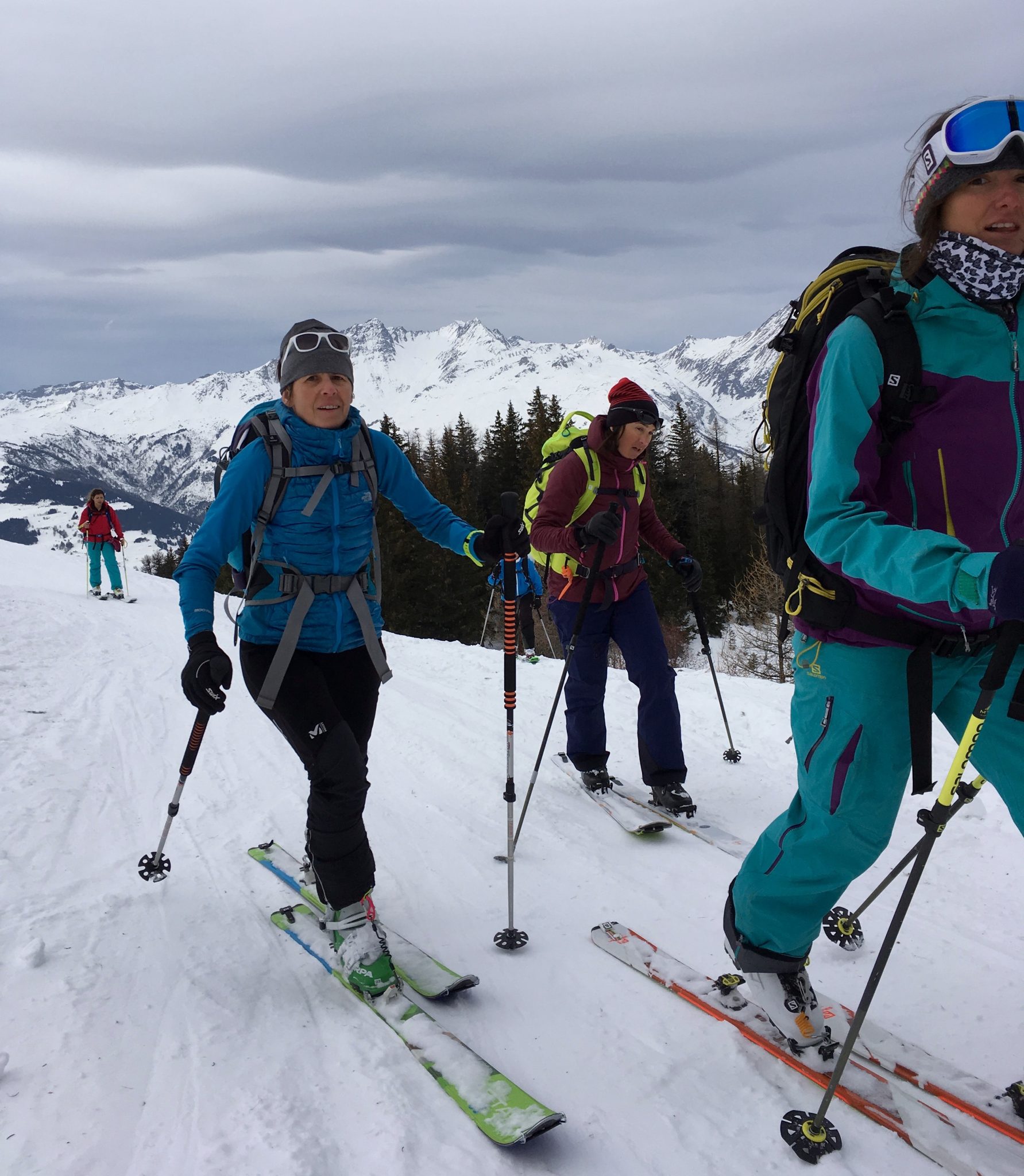 Cette fois les choses se compliquent un peu. La pente est plus raide, la neige roule sous les skis. Liv et Caro nous font quelques démonstrations de conversions, ça paraît tellement facile. Marion s’en sort bien, on sent la maîtrise de la monitrice major de sa promotion! Nous n’atteindrons finalement pas le sommet car nous avons pris notre temps à partager le temps justement. Mais nous ne nous quittons pas avant que Caro ne nous montre à quelle vitesse elle peut retirer ou mettre ses peaux lors d’une compétition de ski alpinisme. Ca nous laisse rêveuses! On retiendra quand même l’ordre à respecter en “un geste”: 1 – Chaussures (position marche ou ski) – 2 – Fixations (à débrayer ou bloquer) – 3 : Skis / peaux (à retirer ou mettre). On se demande comment elle fait pour les fixer convenablement aussi vite. Une bonne idée d’entraînement les jours où les conditions ne sont pas là.