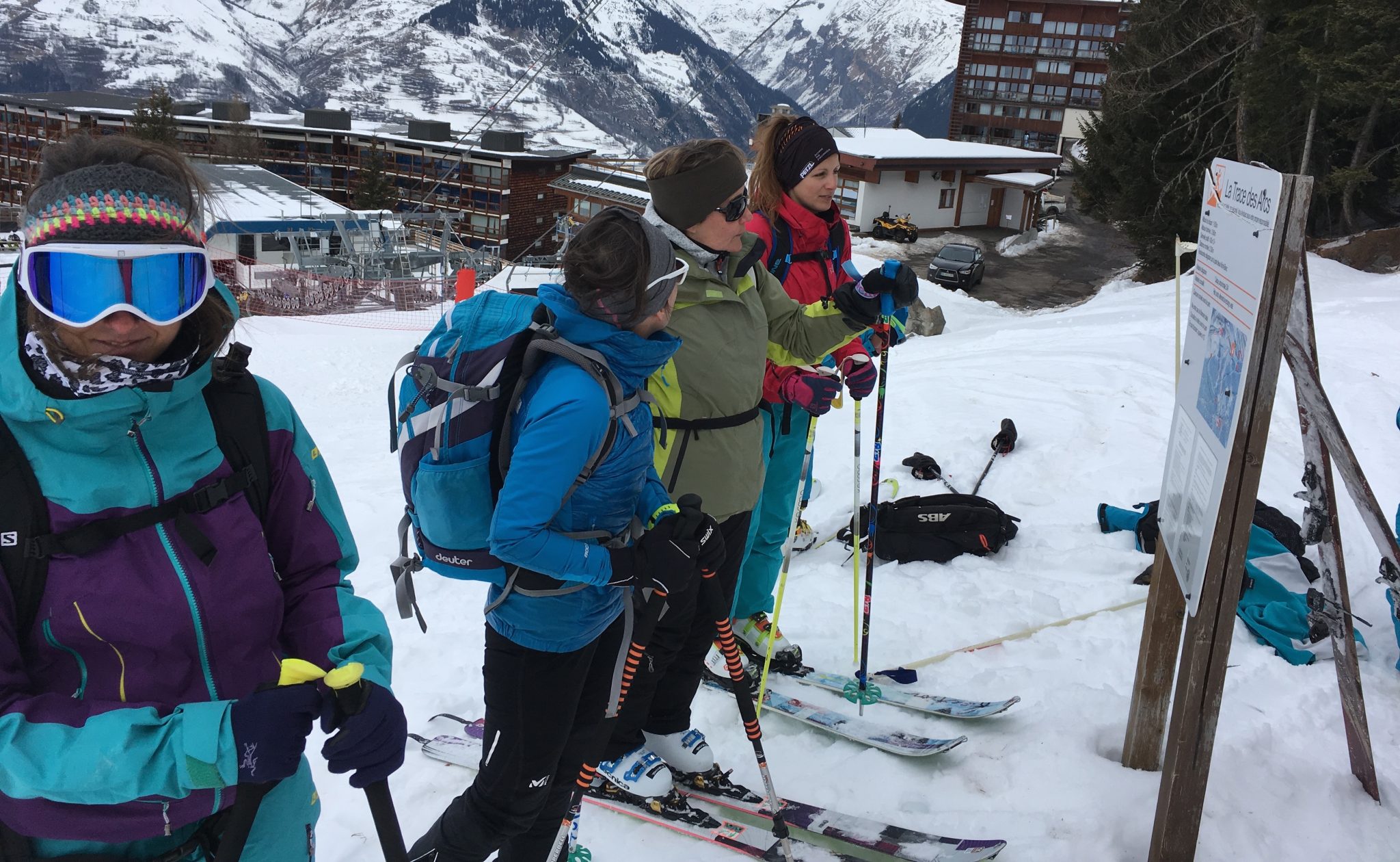 Après avoir rempli mon sac, je retrouve Liv, Caro et les autres filles inscrites. Nous ne sommes que huit au final, les autres s’étant désistées au dernier moment. Nous nous présentons, vérifions avant de partir que nos appareils de recherche de victimes en avalanche fonctionnent bien. Parmi nous il y a Fabienne qui est ici pour les vacances, et qui a été inscrite par son mari. On salue l’initiative de monsieur, et nous voilà parties.