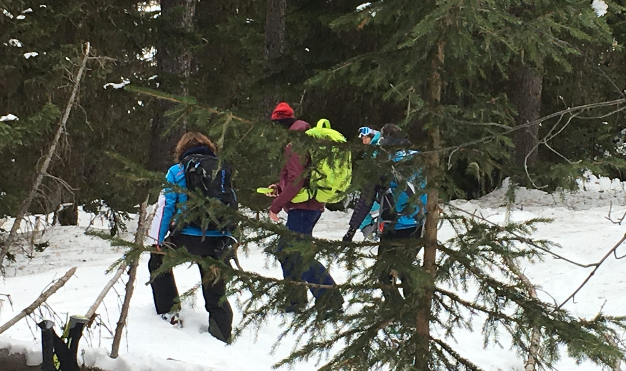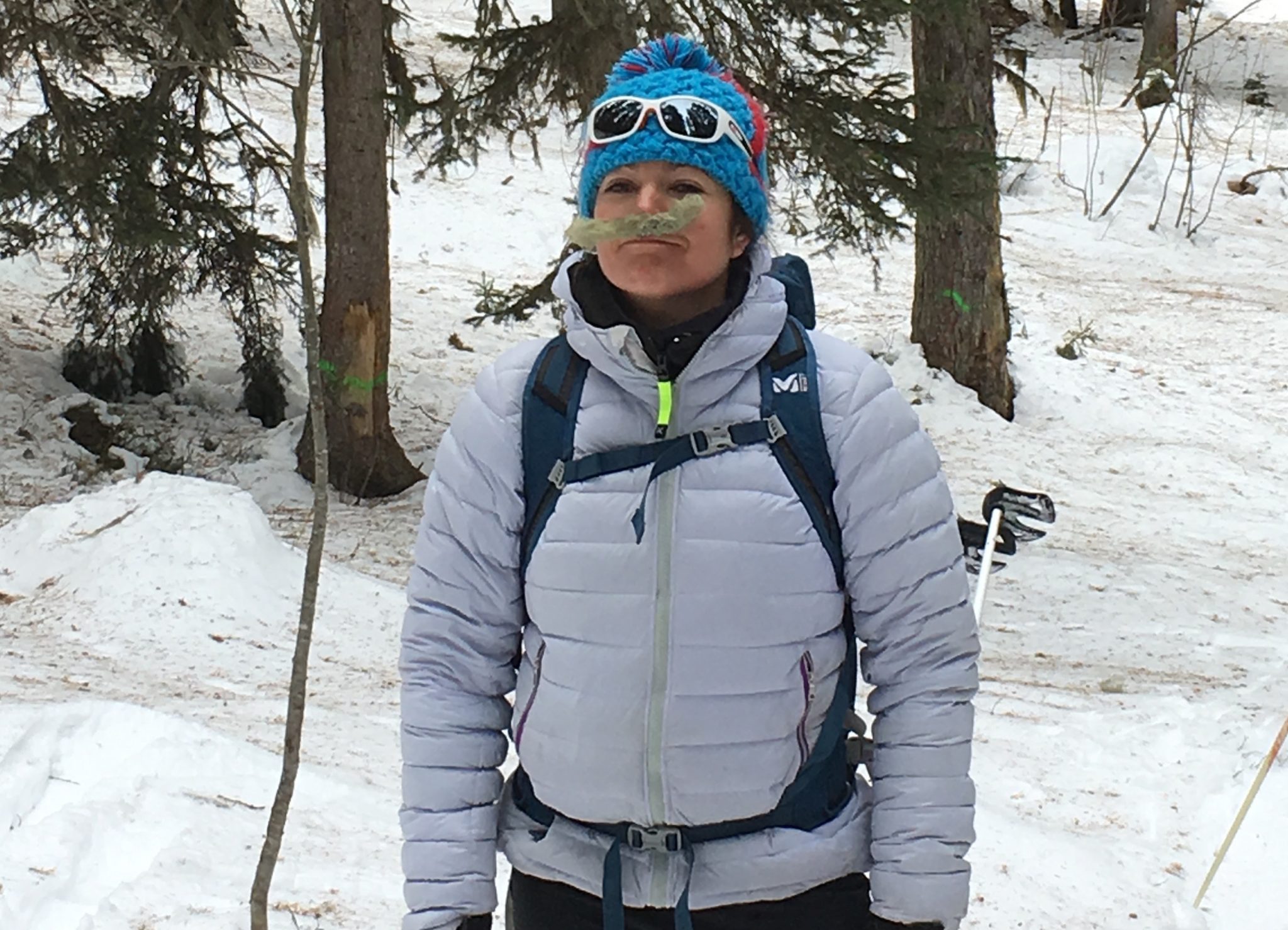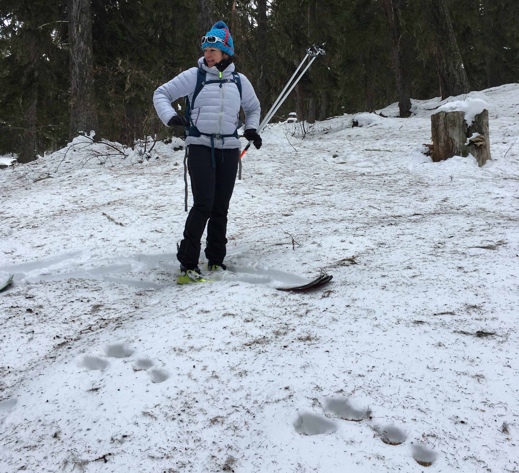 Après une heure trente de montée en forêt et pas moins de 100.000 mots sortis de nos bouches, nous n’avons pas croisé d’animaux (ils ont dû s’enfuir en entendant nos conversations et nos rires!) mais quelques traces de lièvre variable repérés par notre accompagnatrice en montagne Caro. Il est temps de reprendre des forces et de faire un test de recherche de victime. Parce qu’être équipé s’est bien, mais encore faut-il savoir se servir de son matériel. Après quelques rappels fournis par Caro et Liv, nous formons deux équipes et recherchons chacune deux “victimes”. Nous nous débrouillons plutôt bien finalement mais il faut reconnaître que ce n’est pas si simple de s’organiser, d’être rapide et efficace. Et encore nous n’avons pas le stress de savoir une véritable victime ensevelie sous la neige, nous sommes en totale sécurité, dans un endroit facilement praticable… Oui, il est nécessaire de s’entraîner régulièrement à l’utilisation de l’équipement de sécurité.