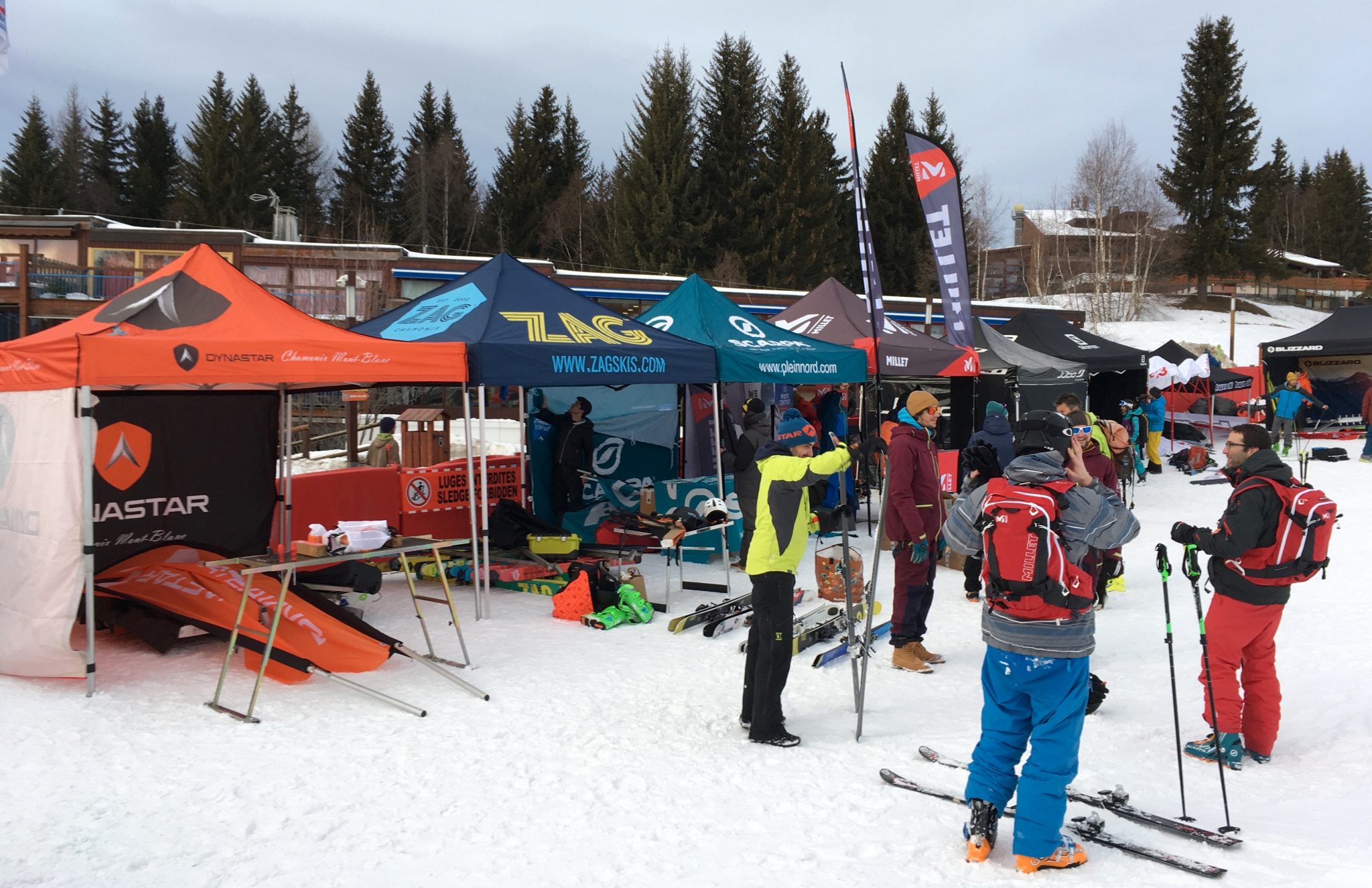 C’est sur le stand Scarpa que je trouve une paire de chaussures que la marque me prête gentiment pour la journée. Même s’il ne fait pas si froid, les testeurs sont choyés : poufs pour s’asseoir et s’équiper, système de chauffage pour les chaussures et quelques explications techniques pour pouvoir utiliser les chaussures convenablement. Avant de me laisser filer, on me règle mes skis. Equipée de chaussures à inserts, j’ai donc choisi les skis montés en King Pin!