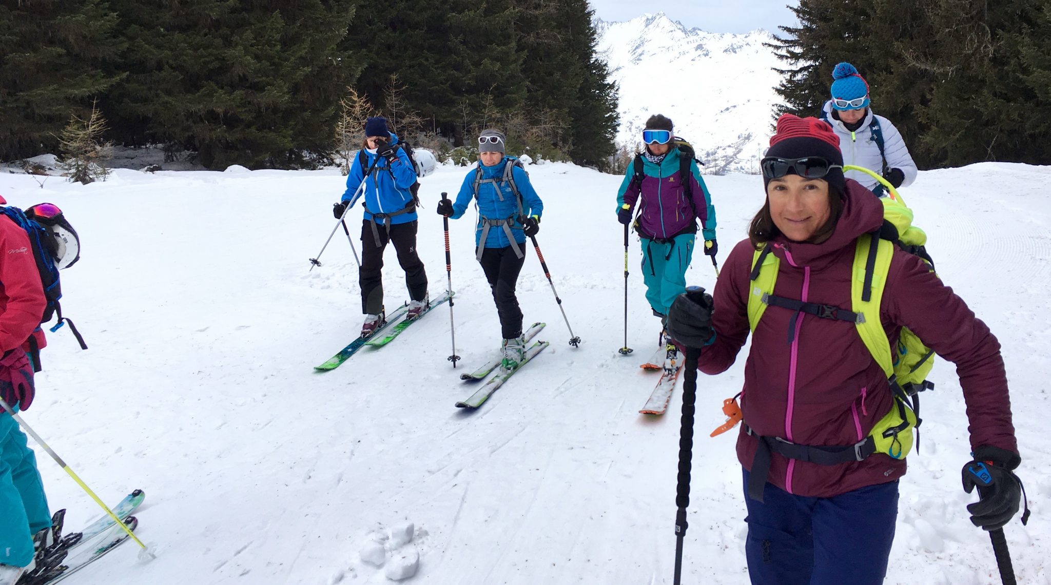 Deux moniteurs viennent nous rejoindre pour nous guider. Nous nous équipons en version montée, posons les casques, mettons en route les DVA, rangeons les doudounes dans le sac, et surtout mettons les peaux. Liv et Caro vérifient que nous avons les convenablement fixées et nous briefent avant la montée : itinéraire, consignes de base, conseils sur la nourriture et l’hydratation. Elles nous rappellent enfin d’allonger nos bâtons pour celles qui ont des modèles le permettant, pour une meilleure efficacité, et de ne pas soulever les pieds en marchant, mais de faire glisser les skis.